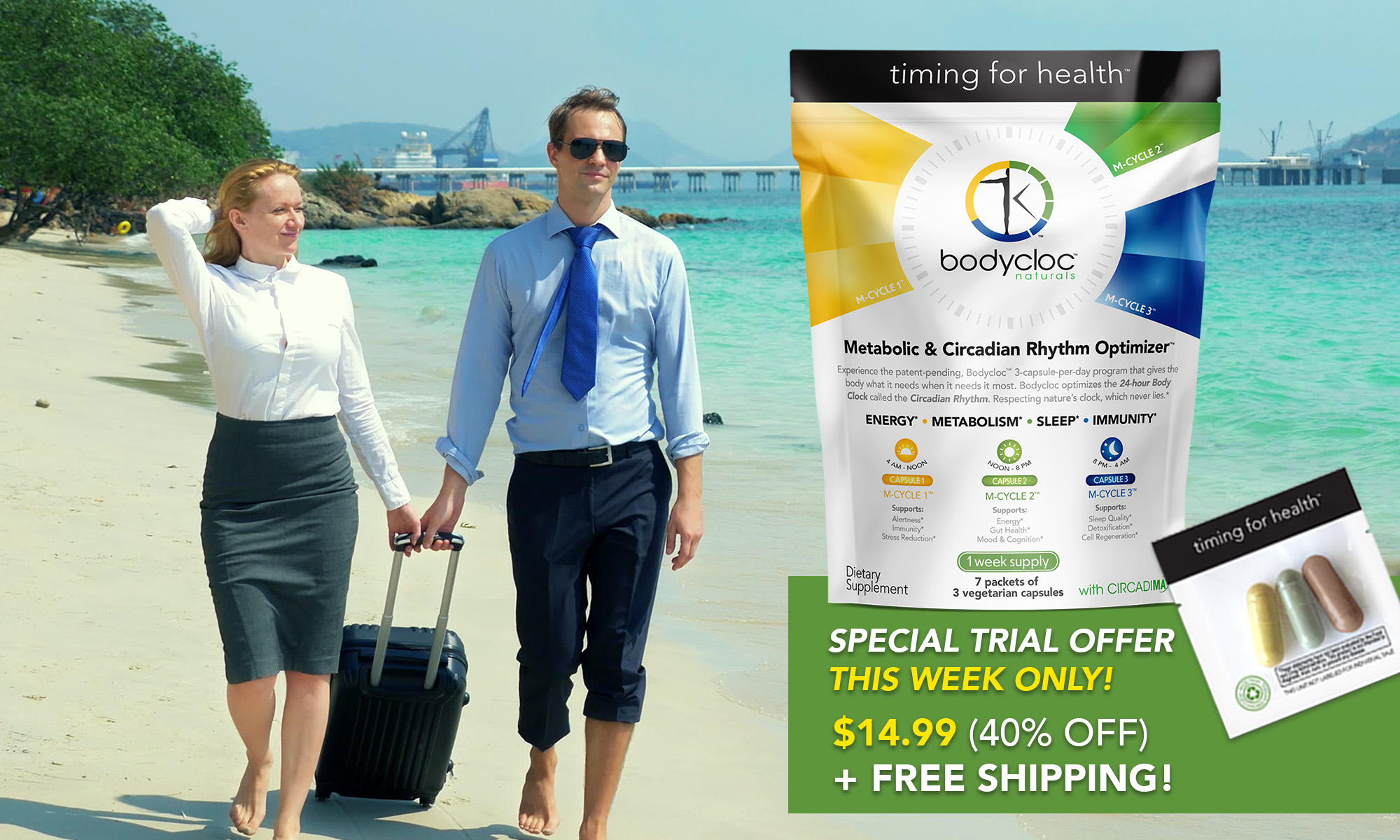 "Bodycloc remarkably eliminated my jet lag overnight and gave me an added daytime boost. The 3-capsule formula processed the nearly 10-hour time change and synched my sleep cycle back to normal in what had always taken several days to a week or more. Will be sure to have this on hand for my next trip."